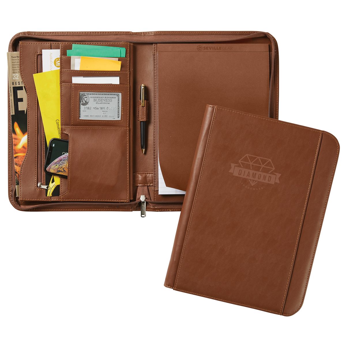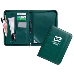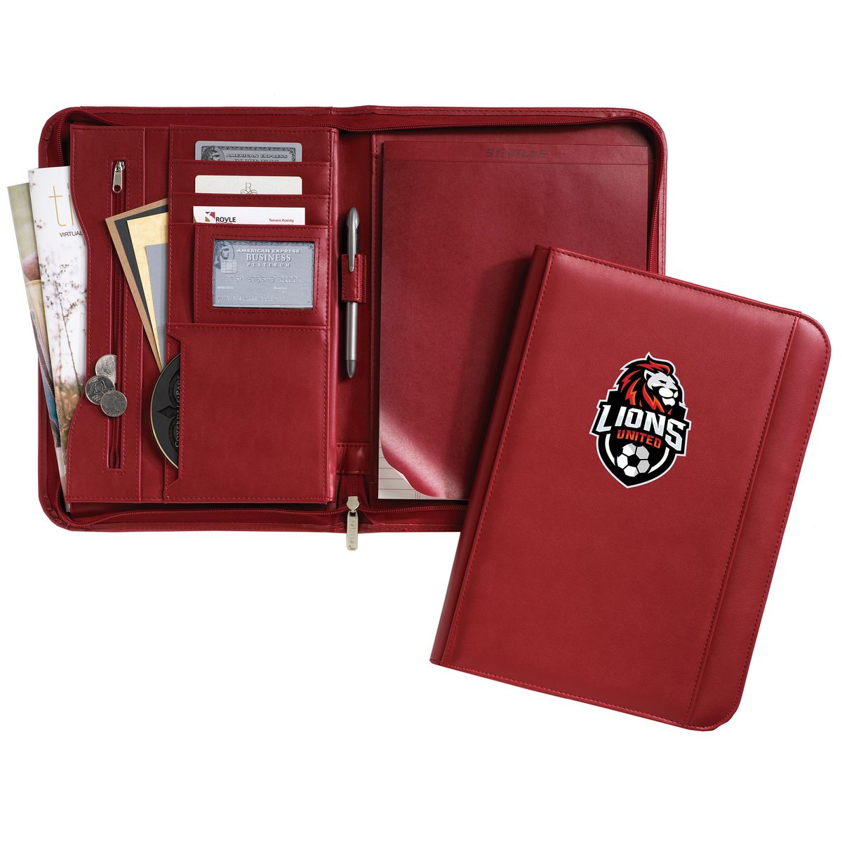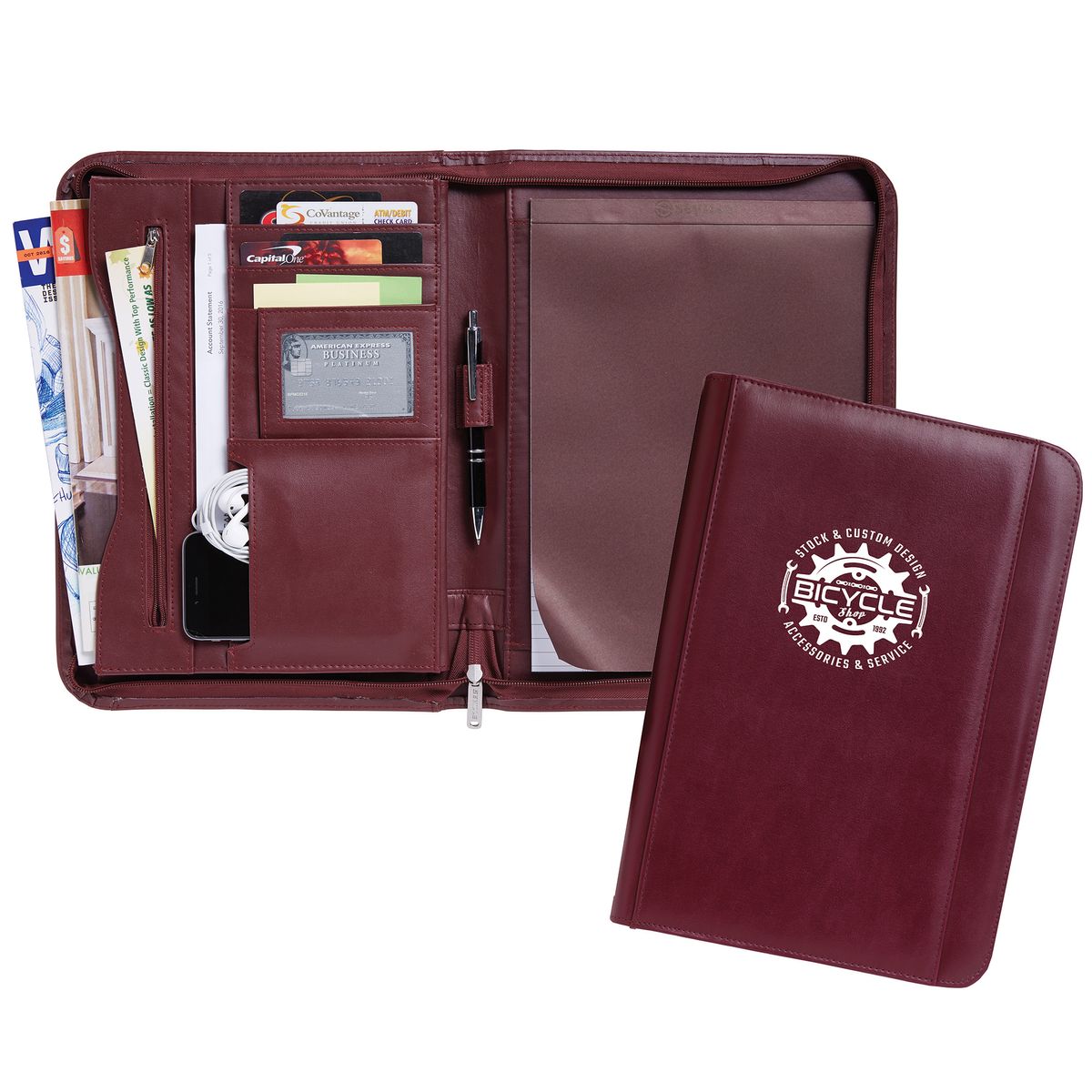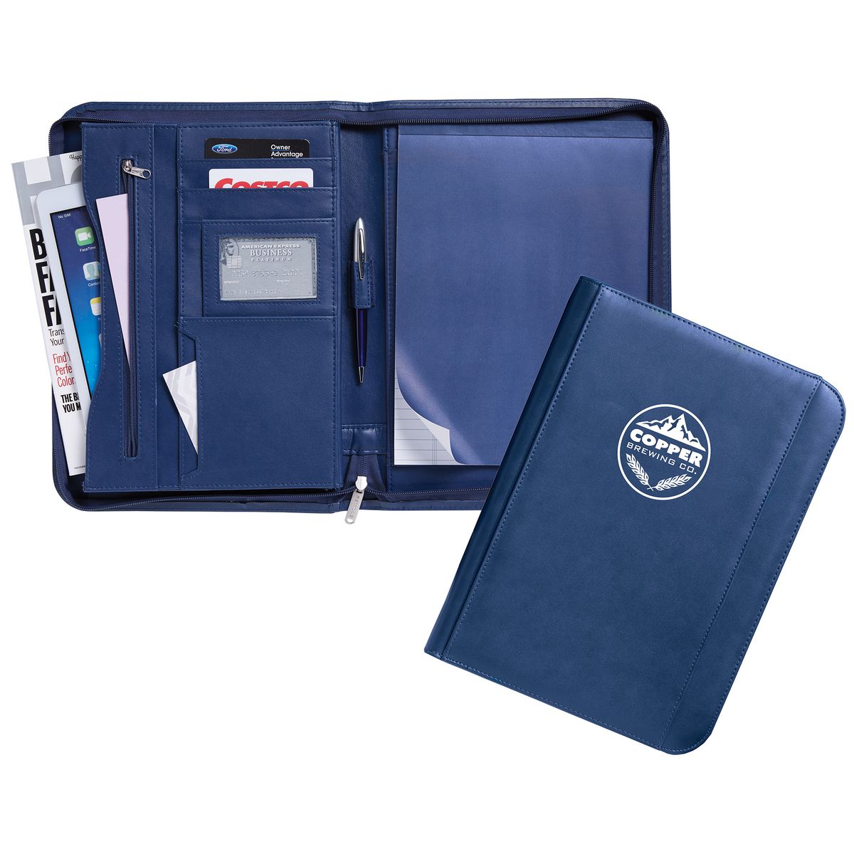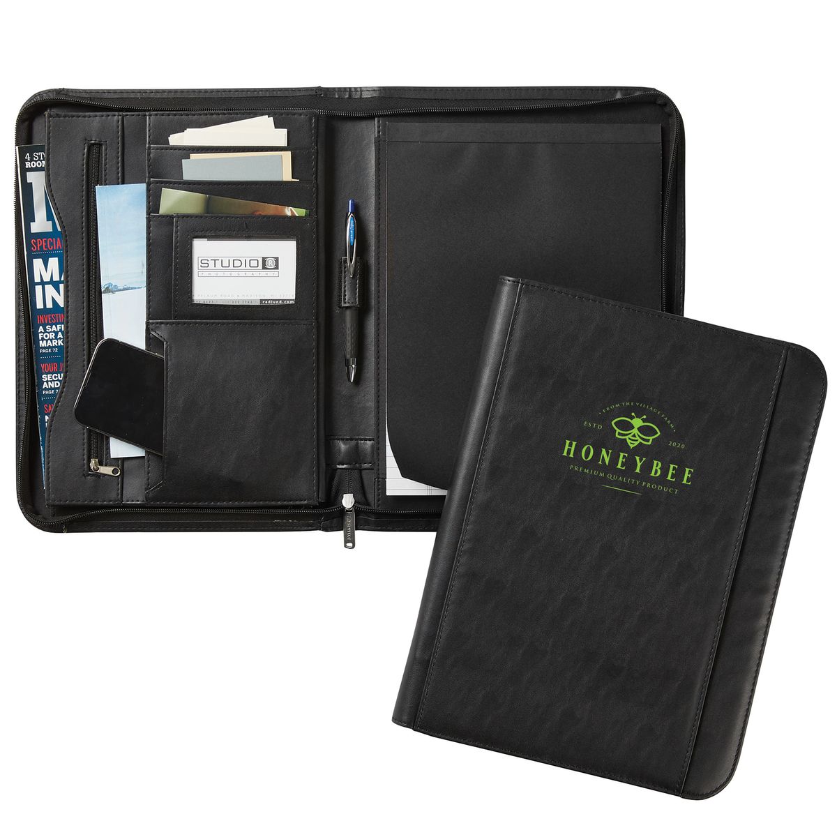 Deluxe Zippered Padfolio – Stay Organized in Style. Never be caught unprepared again. Whether you've misplaced important documents, forgotten where you left your ID, or scrambled to find a pen before a meeting, the Deluxe Zippered Padfolio is your all-in-one solution for staying organized and professional on the go. Crafted from ultra hide simulated leather with the rich look and feel of Nappa leather, this padfolio combines executive appeal with everyday functionality. It's perfect for business meetings, conferences, interviews, or your daily office routine. Key Features: Smart Organization: Includes a gusseted interior file pocket, built-in zippered pocket, business card holder slot, CD pocket, clear ID or calculator pocket, and a wide-body pen holder. Ready for Work: Comes with a full-size 8.5" x 11" writing pad and matching privacy cover—ideal for taking notes wherever you are. Secure and Stylish: A full zipper closure keeps your documents and essentials safe. Samples Available.